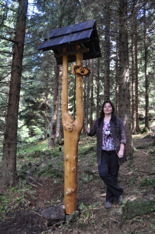 Rozcestníky se směrovkami na naučnou stezku na rysí skálu. Materiál smrk, řezaný smrkový šindel, výška 250 cm.