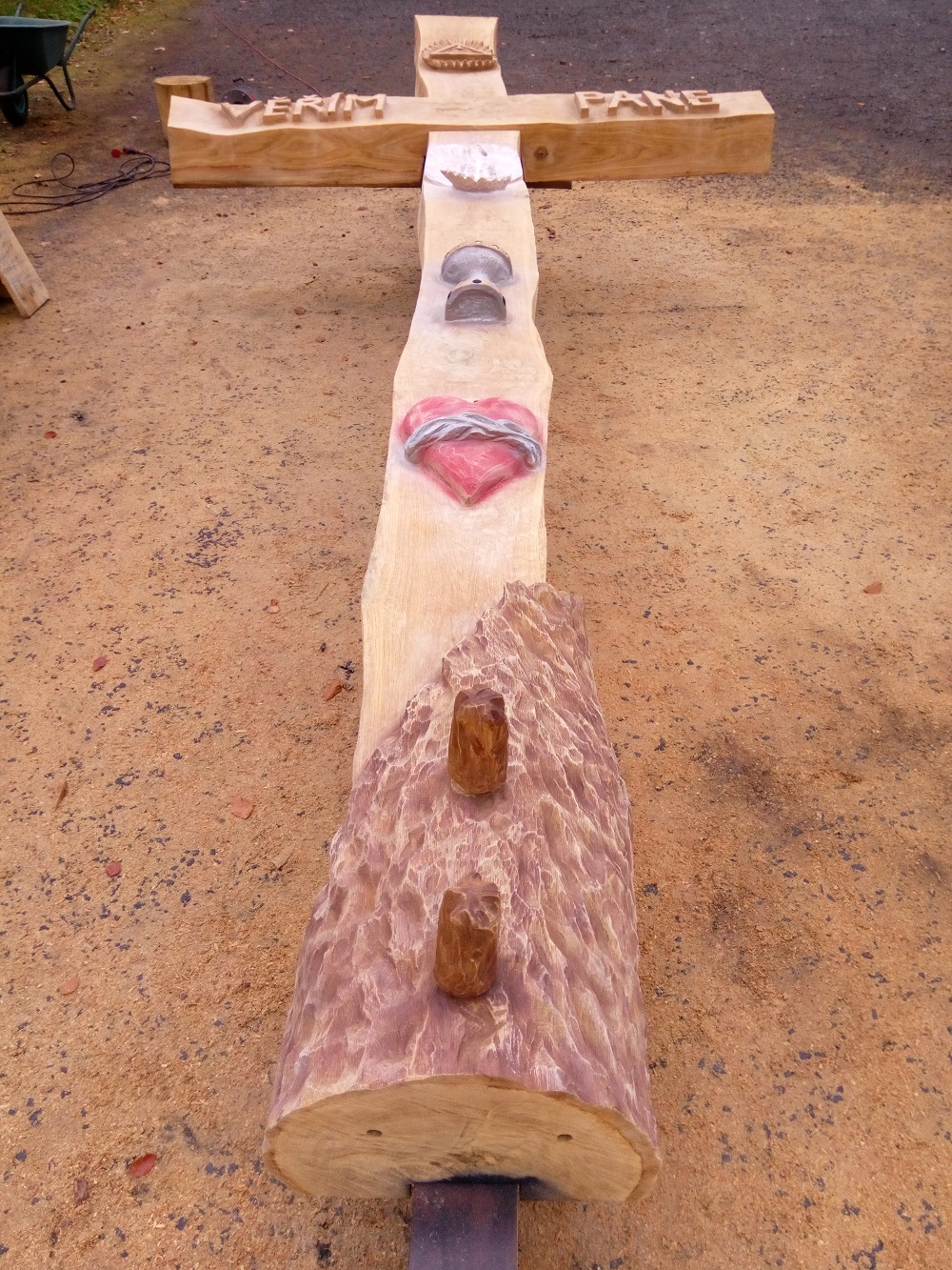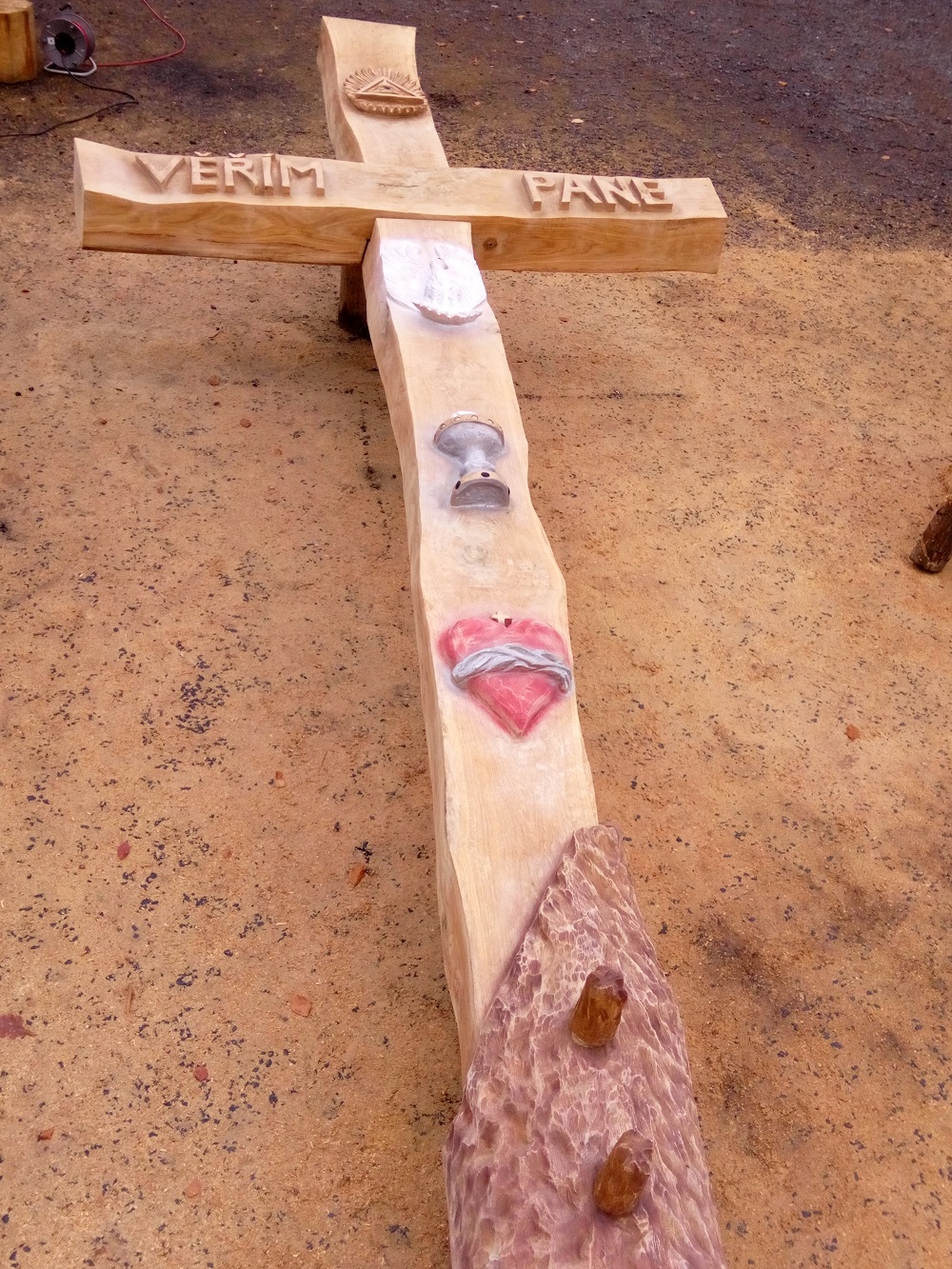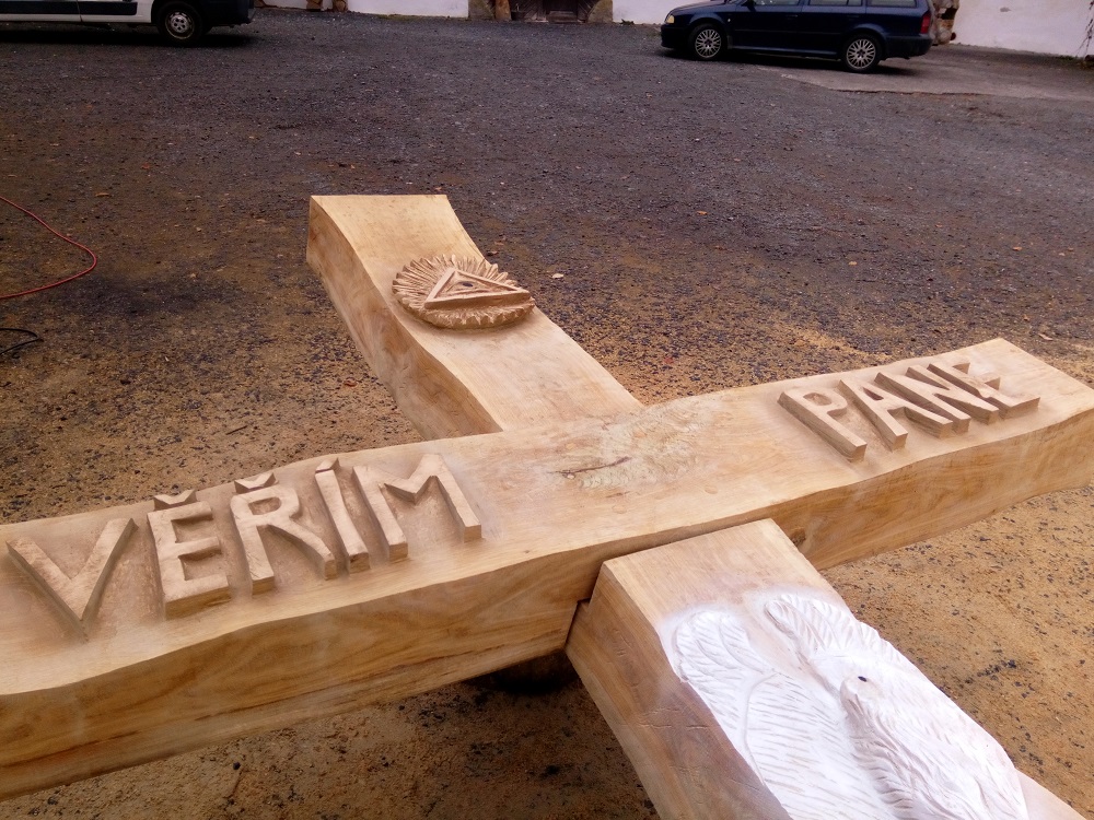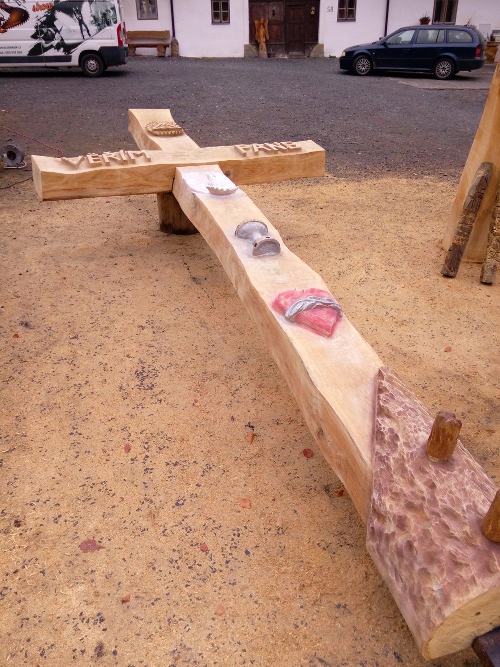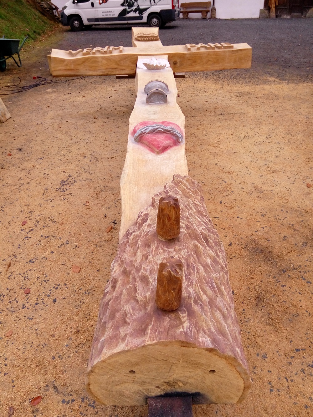 Materiál dub, výška 6 metrů, šířka 2,5 metru, průměr kmene 70 cm. Kříž je vytvořen výhradně motorovými pilami.
