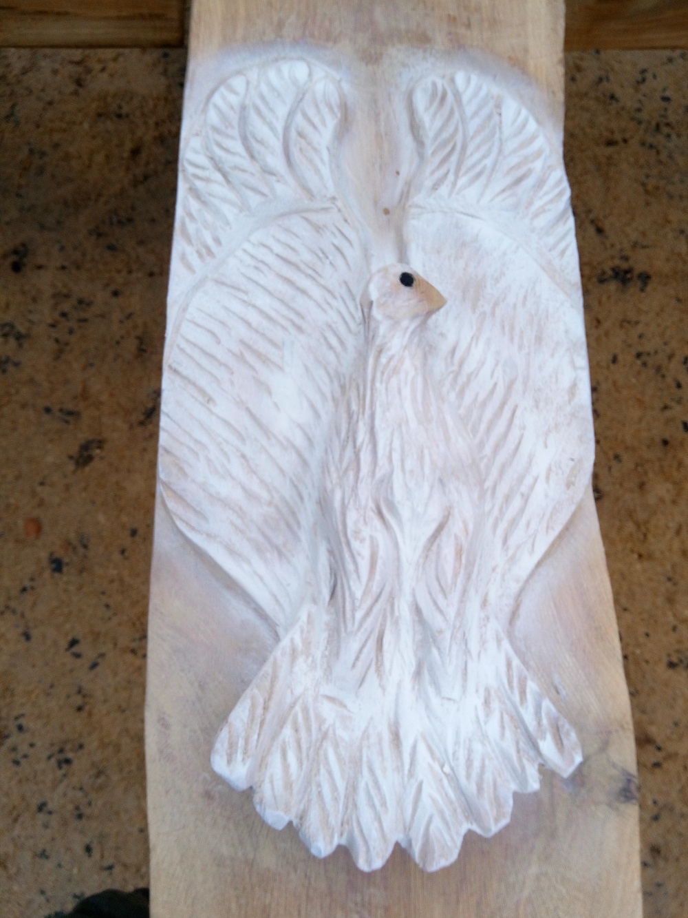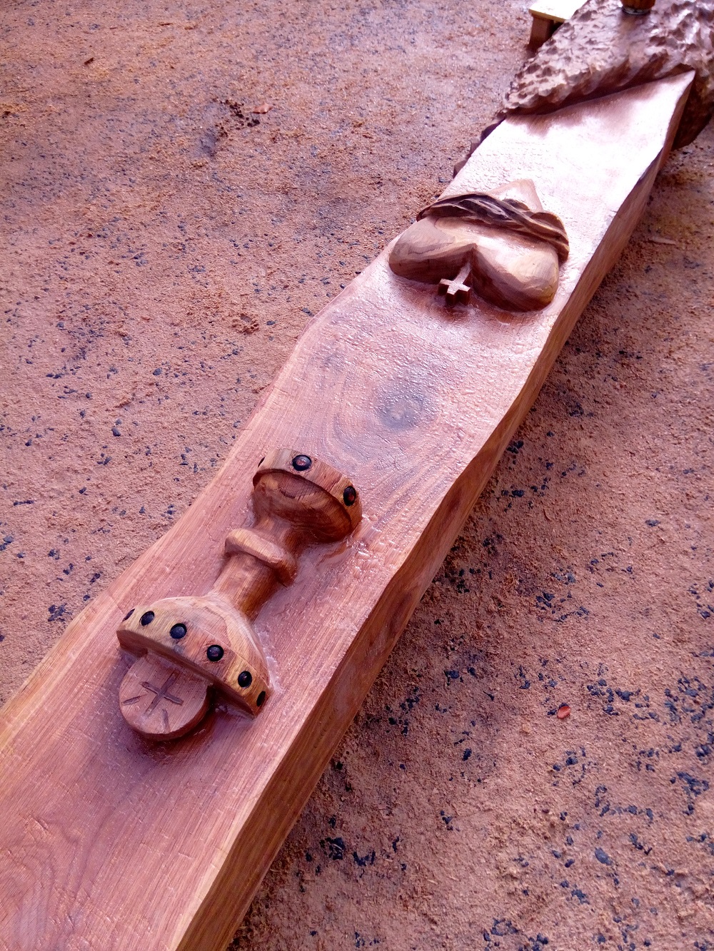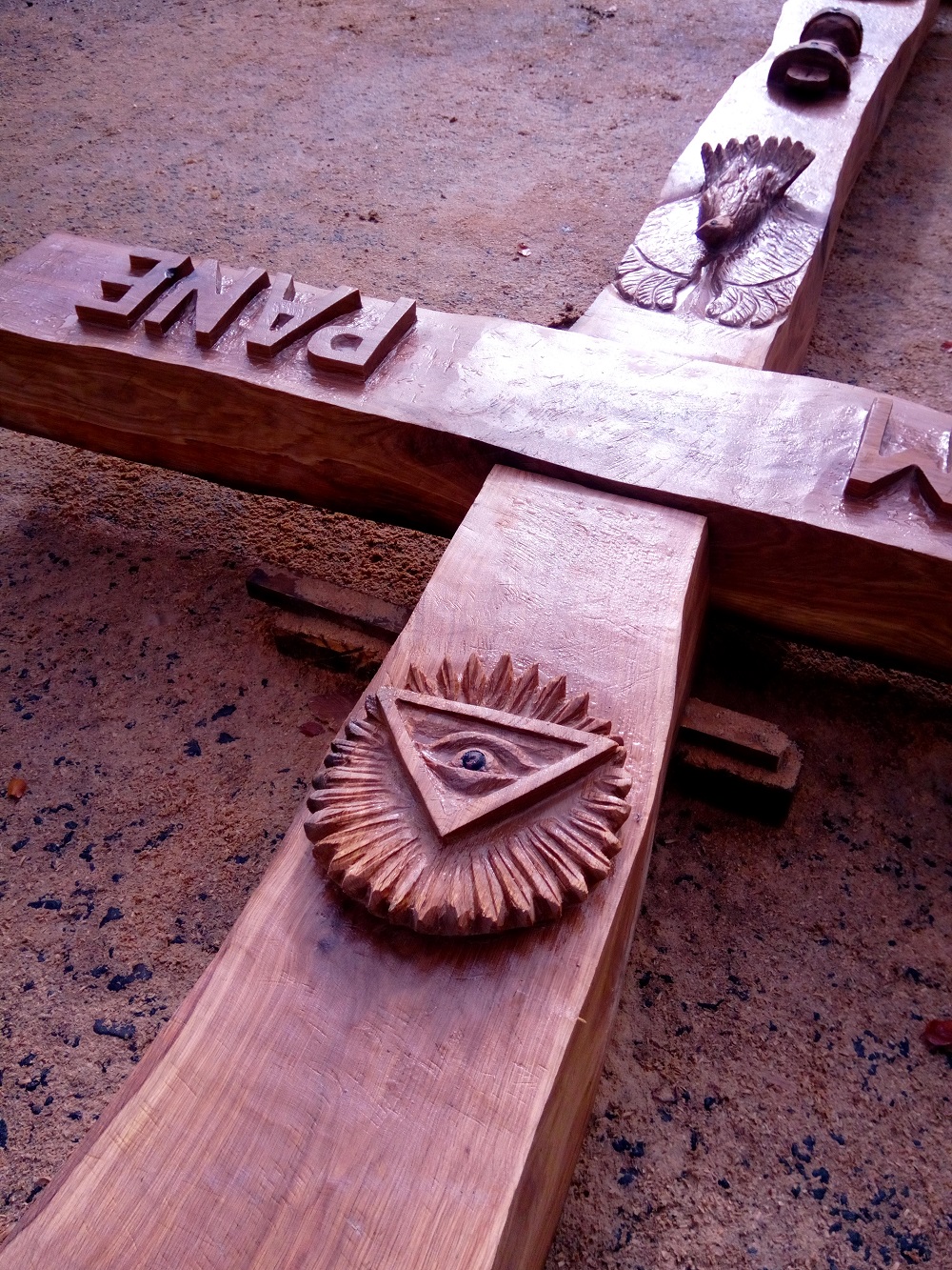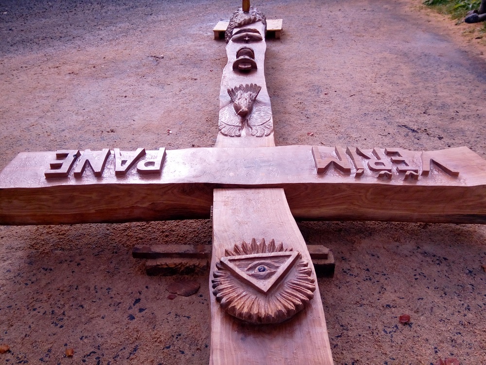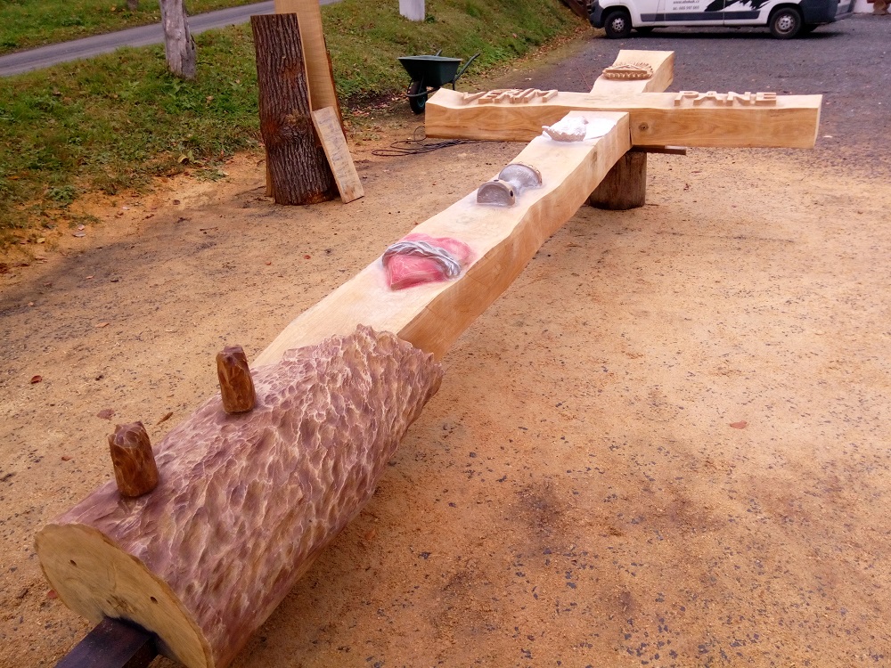 Materiál dub, výška 6 metrů, šířka 2,5 metru, průměr kmene 70 cm. Kříž je vytvořen výhradně motorovými pilami.